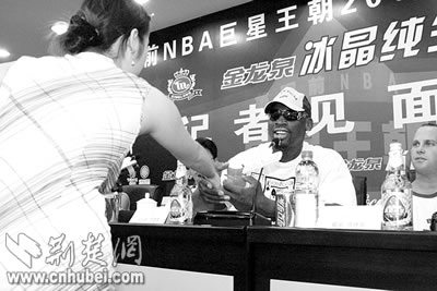 “大蟲”似乎不為所動(dòng),拿起行李,在保安的保護(hù)下向外走。記者們忙起來(lái)了,兩位來(lái)自電視臺(tái)娛樂頻道的記者拿著話筒,沖到羅德曼面前,踮起腳跟,不斷用英語(yǔ)發(fā)問。