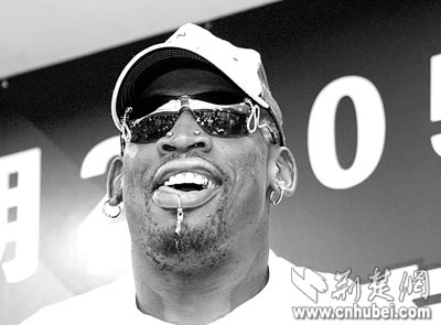 七分鐘后,前NBA巨星羅德曼出現(xiàn)在人們的視野里。他顯得有些疲倦,白色球帽遮住了那大半個(gè)五顏六色的后腦勺,不過那張有些冷酷的臉,還是讓人很快認(rèn)出,這就是那個(gè)我行我素的“大蟲”羅德曼。