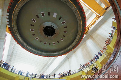 今年8月1日,三峽左岸電廠的最后一臺(tái)發(fā)電機(jī)組轉(zhuǎn)子吊入機(jī)坑(圖二)。令三峽建設(shè)者們感到自豪的是,這同樣是世界上最大的發(fā)電機(jī)組,不同的是其零部件國(guó)產(chǎn)化程度達(dá)到85%。