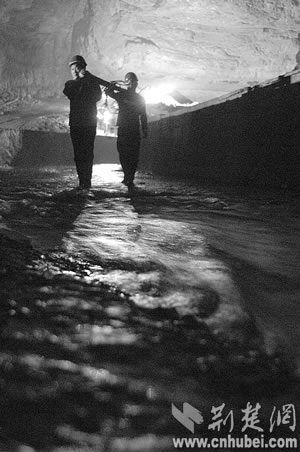 寂寞的蝙蝠第一次接待了人間來客,沉睡萬年的巖溶洞穴第一次迎來了觀者。但黑暗陌生的世界還是讓堂堂男兒們感覺了一絲陰森恐怖。他們曾聽當(dāng)?shù)匕傩諅髡f,洞里有巨蟒,所以至今沒人敢進(jìn)洞!白ゾo時間測量!”來不及恐懼,他們?yōu)樽约汗膭,因為這里隨時可能發(fā)生漲水、墜落等危險?上В谝淮谓(jīng)驗不足,手電筒的電池很快用完了,一行人只得互相攙扶著,摸索出溶洞!昂髞,我們又進(jìn)去了7次,終于測出了暗河的具體位置和流向。”方文武說。