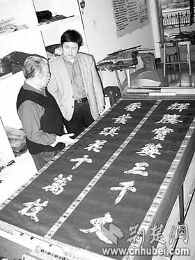 荊楚網(wǎng)消息(楚天都市報(bào))(記者何君輝)昨日,收藏者王先生在漢繡傳人任本榮家中,展示了自己珍藏的一幅刺繡對(duì)聯(lián)。對(duì)聯(lián)長2.4米,以花朵圖案拼接出“輝騰寶婺三千丈香發(fā)琪花十萬枝”字樣。王先生說,自己十多年前在地?cái)偵匣?00元購得這件繡品,一直沒有機(jī)會(huì)為它“驗(yàn)明正身”