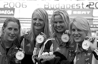 7月31日,在歐洲游泳錦標賽女子4×100米自由泳接力決賽中,德國隊以3分35秒22的成績奪得冠軍,并打破了澳大利亞隊2004年創(chuàng)造的3分35秒94的世界紀錄。圖為德國選手達爾曼(左二)、格茲(右)、斯特芬(右二)和利普在頒獎儀式上。