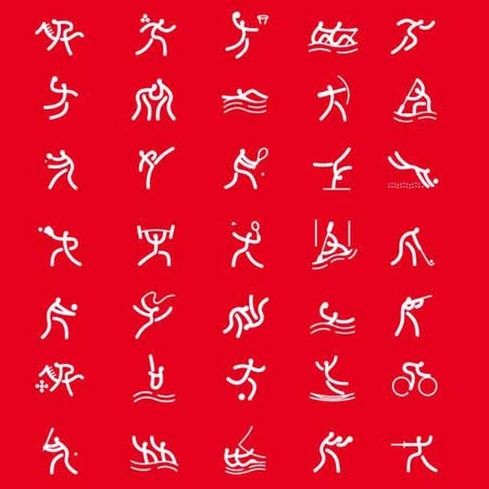 北京奧運(yùn)會體育圖標(biāo)設(shè)計(jì)包括35個(gè)圖標(biāo),分別是田徑、賽艇、羽毛球、棒球、籃球、拳擊、皮筏艇(靜水)、皮筏艇(激流)、自行車、馬術(shù)、擊劍、足球、體操、藝術(shù)體操、蹦床、舉重、手球、曲棍球、柔道、摔跤、游泳、花樣游泳、跳水、水球、現(xiàn)代五項(xiàng)、壘球、跆拳道、網(wǎng)球、乒乓球、射擊、射箭、鐵人三項(xiàng)、帆船、排球和沙灘排球。