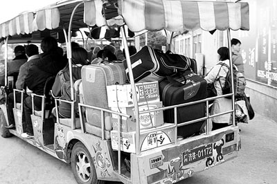 7日,幾名農(nóng)民工乘坐煙臺(tái)火車站的免費(fèi)電瓶車進(jìn)站。據(jù)介紹,從2005年12月24日開始,煙臺(tái)火車站為返鄉(xiāng)的農(nóng)民工開辟了“綠色通道”,為傷殘或行李較多的農(nóng)民工排憂解難。(新華社發(fā))