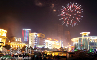 荊楚網(wǎng)消息(楚天金報)記者胡彩麗、畢衛(wèi)報道:“火樹銀花不夜天,爆竹聲聲慶新春!弊蛱,金豬年春節(jié)的元宵節(jié),一輪鵝黃的圓月映照三鎮(zhèn),八百萬江城人的歡樂和激情,化作了漫天絢爛的禮花和連綿不絕的鞭炮聲。