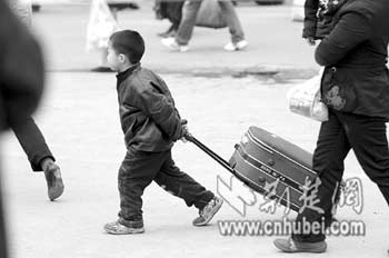 昨日,武昌火車(chē)站進(jìn)站口,快樂(lè)的小方樾幫大人拖著行李箱(上圖)。