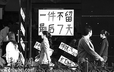 昨日,武漢市江漢路某品牌商店用碩大的“褲”字吸引行人購買欲(圖一)。在市場競爭激烈的今天,“臉面”設計成為商家費勁腦筋追逐的重心,但也有一些商家長期打著“大甩賣”的旗號欺騙消費者,頗煞風景(圖二)。記者 張鴻 攝