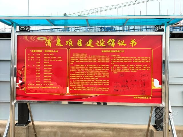 赤壁中試谷·智能無人系統(tǒng)測試基地赤壁市水建集團項目部前的清廉項目建設(shè)倡議書的簽名板上,密密麻麻地簽滿了名字。一個簽名就是一份承諾,一個簽名就是一份責任,一個簽名就是水建集團建設(shè)清廉國企的堅實基礎(chǔ)。