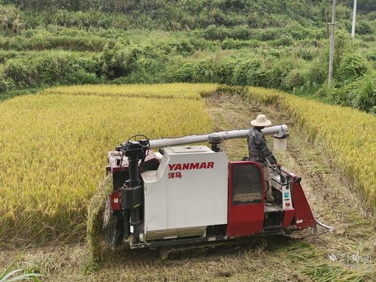 荊楚網(wǎng)(湖北日?qǐng)?bào)網(wǎng))訊(通訊員 吳儀)11月6日,通山縣南林橋鎮(zhèn)湄溪村鄉(xiāng)林合作社再生稻種植基地上千余畝水稻大部分收割完畢,收割機(jī)在稻田里穿梭收尾,一株株稻穗換來(lái)金燦燦的稻粒,鄉(xiāng)間沃野一派豐收景象。