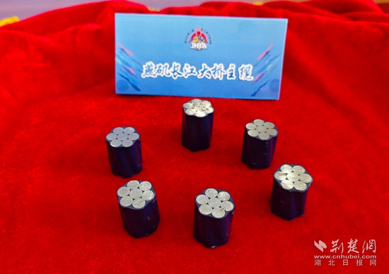 燕磯長(zhǎng)江大橋的項(xiàng)目書(shū)記、工會(huì)主席喻林峰介紹,這6根鋼索來(lái)自燕磯長(zhǎng)江大橋的主纜,它是2100兆帕的高強(qiáng)鋼索。燕磯長(zhǎng)江大橋是世界最大跨徑四主纜懸索橋,同時(shí)也是世界首座不同垂度四主纜雙層鋼桁梁懸索橋。大橋一共有四根主纜,每根主纜有217根索股,每根索股由127根如此次捐贈(zèng)的鋼索構(gòu)成。