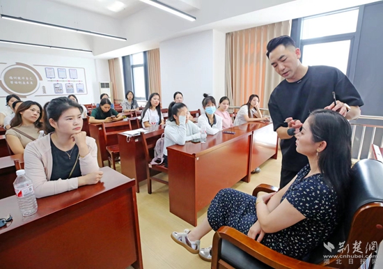 培訓(xùn)室內(nèi),30名通過人社“一湖三鏈”數(shù)據(jù)湖+就業(yè)服務(wù)站鐵腳板匹配的女性居民,正在接受來自盛美化妝美甲培訓(xùn)技能學(xué)校的就業(yè)指導(dǎo)師周艷君的精準(zhǔn)培訓(xùn)。
