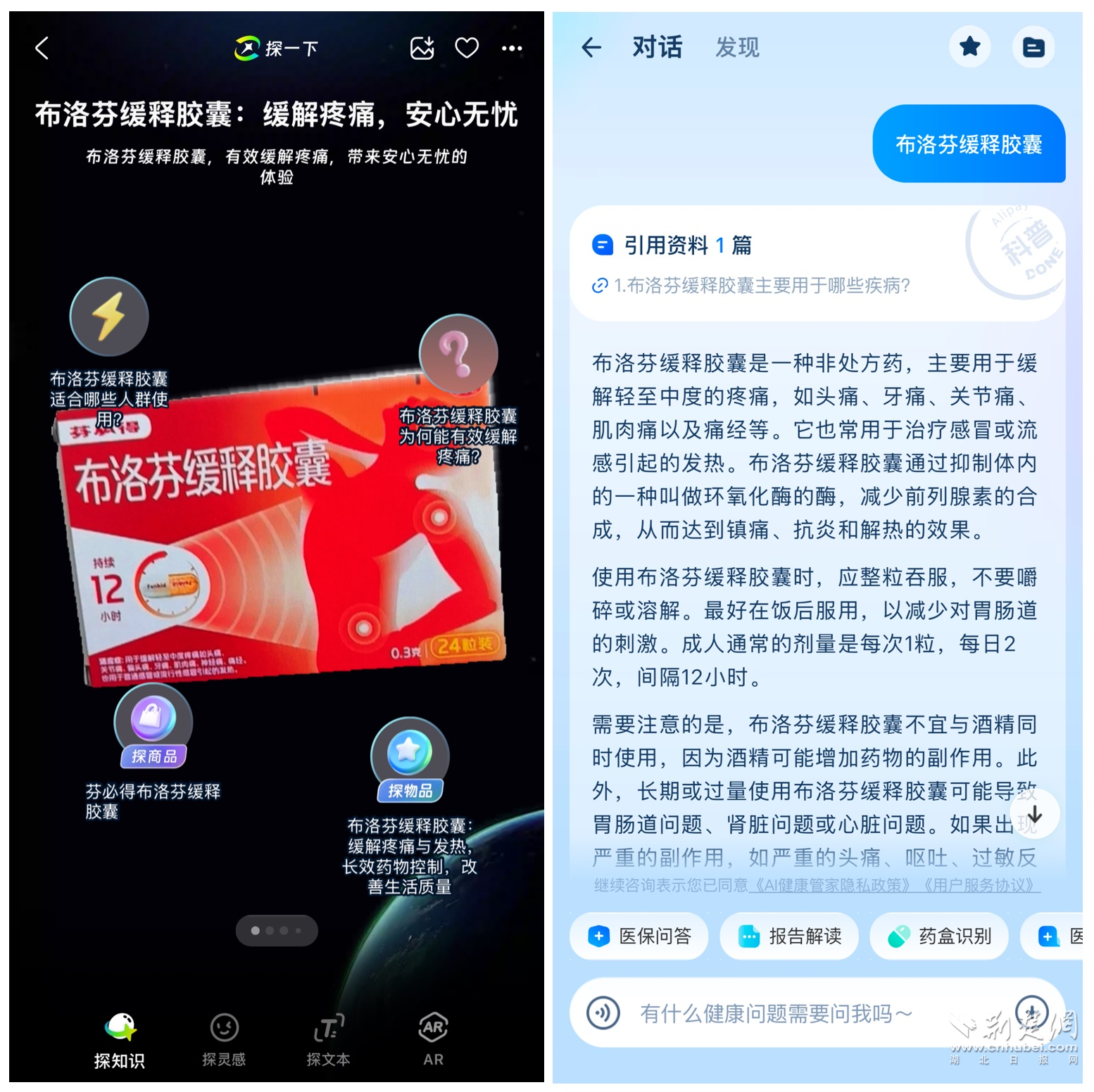 遇到讀不懂的外文商品,探一下就能獲取詳情,更方便線上買同款;家里丟了說(shuō)明書(shū)的藥盒,不僅可查到詳細(xì)介紹,還能調(diào)用支付寶旗下“AI健康管家”追問(wèn)更多的用藥須知。