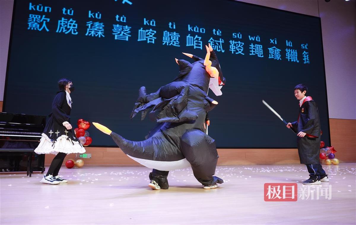 704班學生演了一出《達拉崩吧》話劇,騎士、公主、國王、恐龍、馬的服裝是他們定的,炫酷搞笑的視頻布景也是他們做的?!拔覐男⊥婢幊?,這個還好啦,演恐龍的寇樂芊也有幫我剪視頻?!逼渲猩砑鎸?dǎo)演、舞美設(shè)計、騎士扮演者三職的劉致銘說?!拔野嗪⒆友荨妒刈o之光》小品,就找劇本我?guī)土它c忙,其他都是他們自己安排。上周五全校彩排我第一次看完全劇,發(fā)現(xiàn)他們好有創(chuàng)意,好會演?!?05班班主任徐怡楠驕傲地說,每次活動都發(fā)現(xiàn)許多學生的閃光點,正如“走過冬天”藝術(shù)節(jié)的slogan(口號)所說,在活動中,青春多了一份厚實,人生多了一份財富。