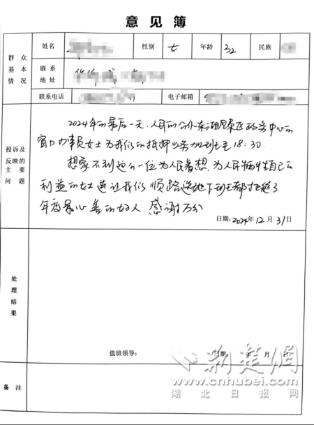面對如此高效而貼心的服務(wù),鄭女士深受感動。她在意見簿上情不自禁地寫道:“人民公仆……為人民著想……年度最心善的好人,感謝萬分!”簡短的文字凝聚了鄭女士對東湖不動產(chǎn)登記窗口工作人員的深深敬意和感激之情。