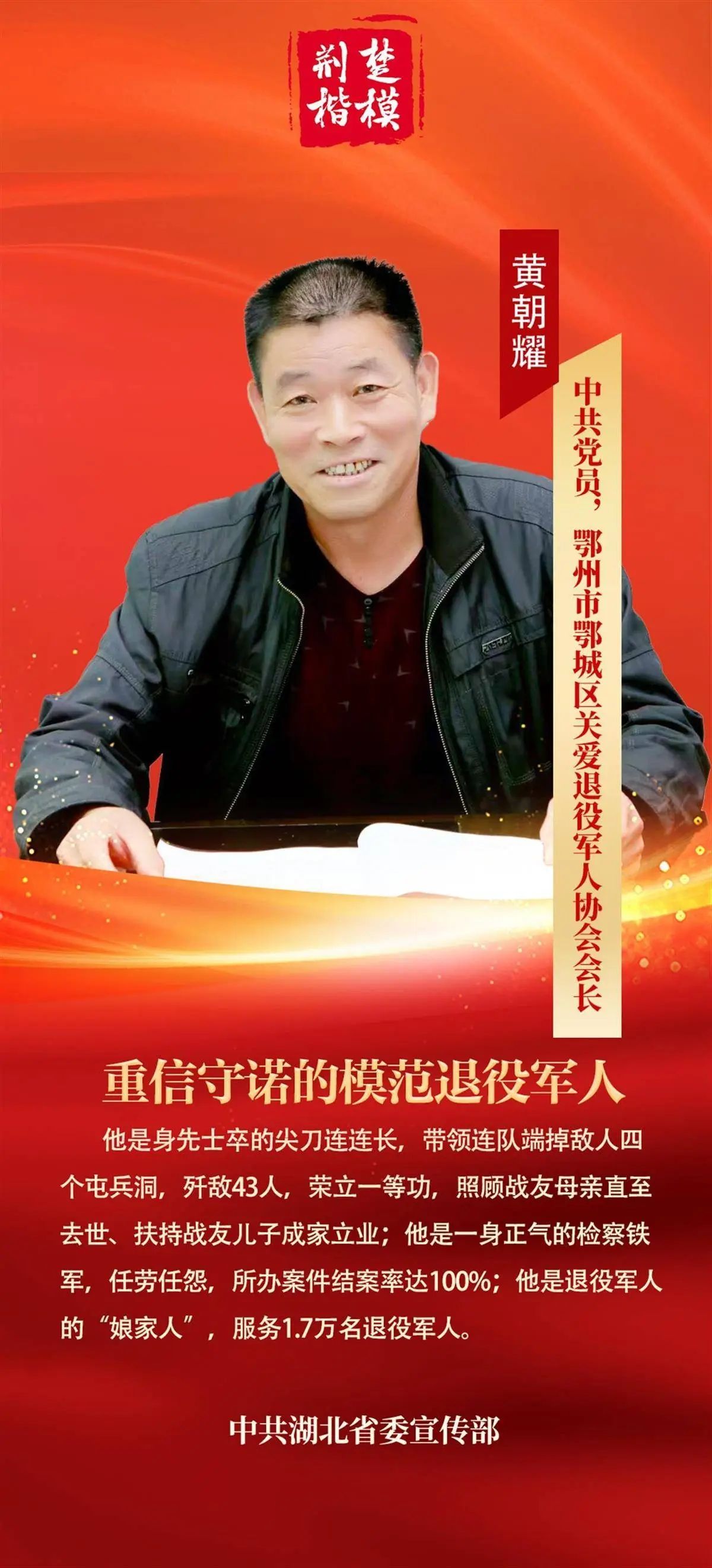 “荊楚楷?!标P(guān)于黃朝耀的頒獎詞為:他是身先士卒的尖刀連連長,帶領(lǐng)連隊(duì)端掉敵人四個屯兵洞,殲敵43人,榮立一等功,照顧戰(zhàn)友母親直至去世、扶持戰(zhàn)友兒子成家立業(yè);他是一身正氣的檢察鐵軍,任勞任怨,所辦案件結(jié)案率達(dá)100%;他是退役軍人的“娘家人”,服務(wù)1.7萬名退役軍人。2024年,他榮獲“全國模范退役軍人”榮譽(yù)稱號。