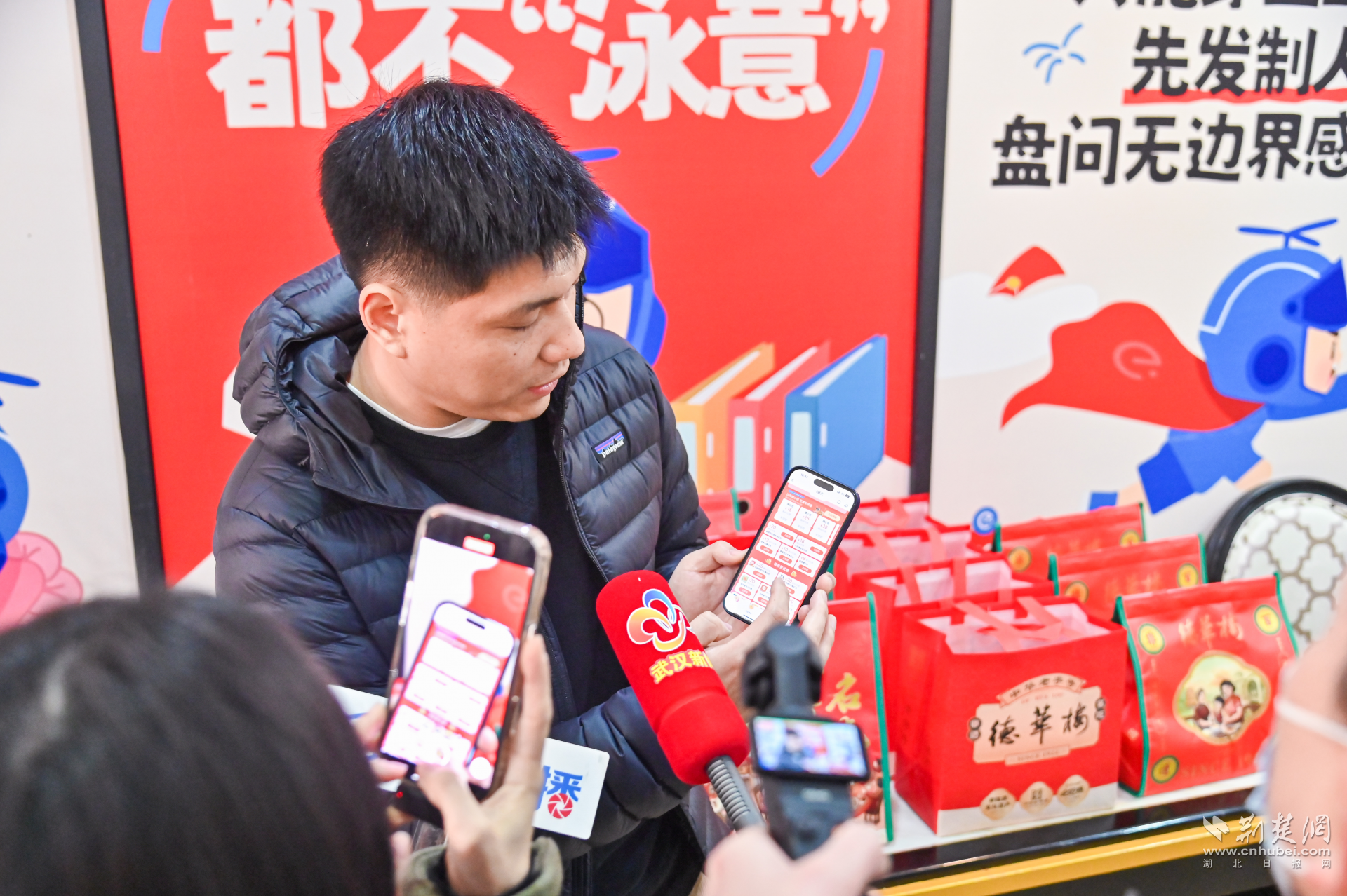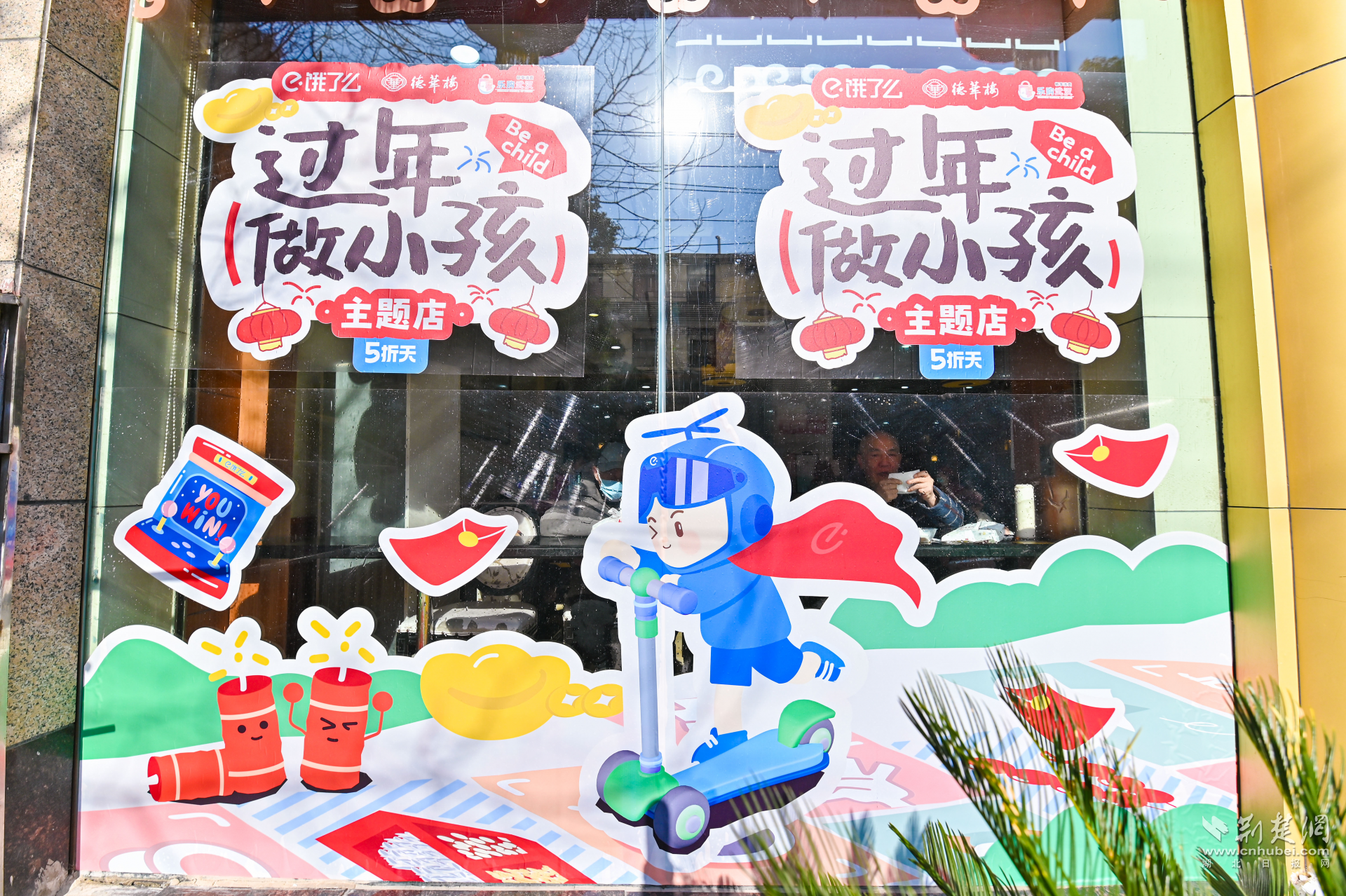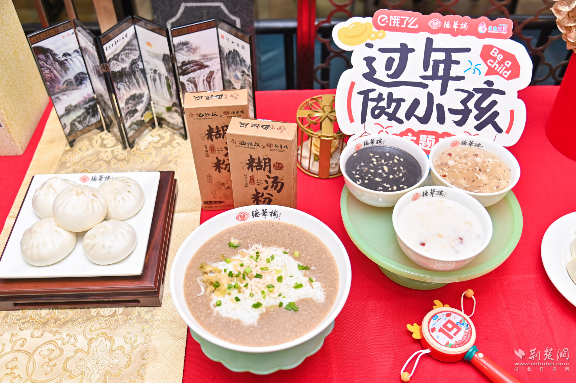 當天,德華樓六渡橋店變身年貨快閃店,門口大鐵鍋現(xiàn)炸的熱氣騰騰的肉圓子,一字排開的水磨年糕、餃子等,以及排著長隊打年貨的武漢市民,讓武漢新春濃度再加碼。走近店內,仿佛回到童年。地板上跳格子的地貼,喚醒了與童年小伙伴在街巷里份跳格子的好時光,呼應著墻面上以“不想長大”各種趣味招貼畫,讓人備加想念童年的滋味和年味。