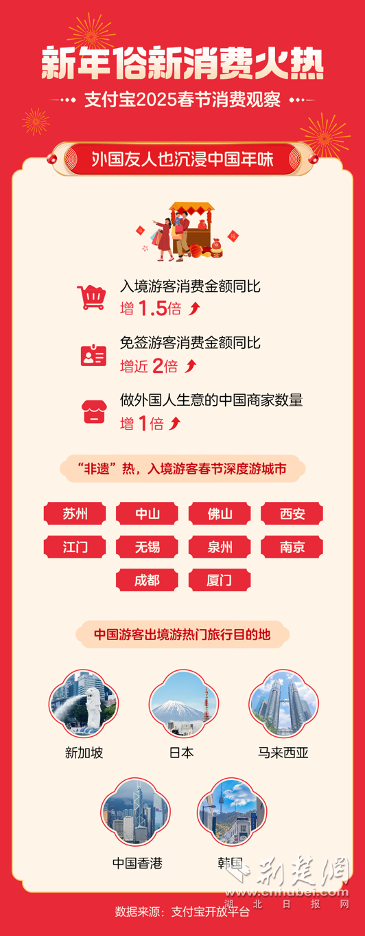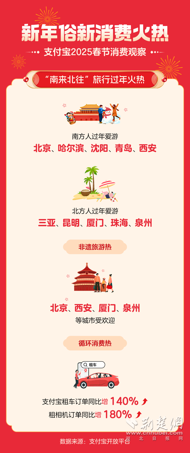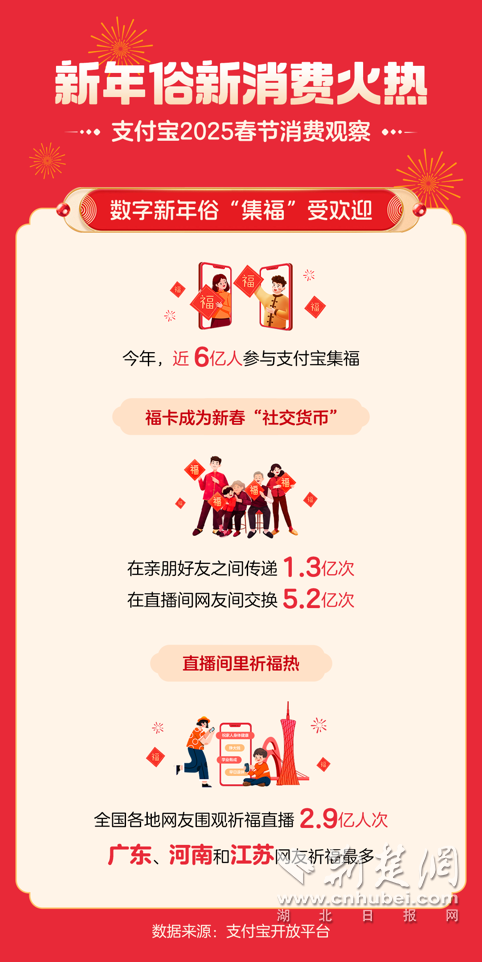 荊楚網(wǎng)(湖北日?qǐng)?bào)網(wǎng))訊 (通訊員 汪雨)2月3日,支付寶發(fā)布的2025春節(jié)消費(fèi)觀察顯示:蛇年春節(jié),新年俗新消費(fèi)火熱。