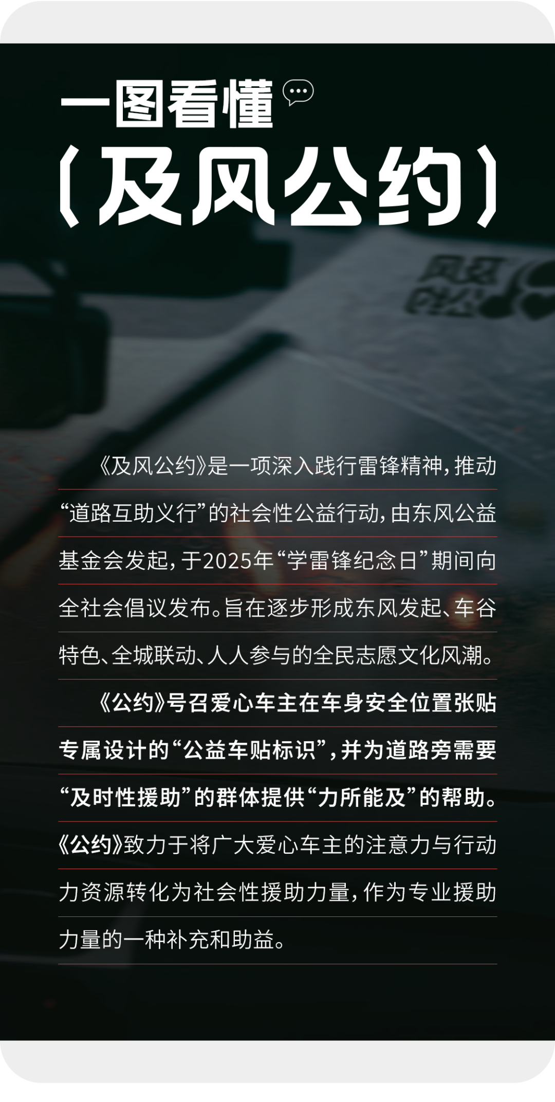 今天,我們以車輪為筆,重新書寫新時代的雷鋒日記。當(dāng)千萬車主的點滴善意匯成江河,這股東風(fēng)必將升騰而起,讓“及風(fēng)行動”成為新時代向上向善的生動注腳!