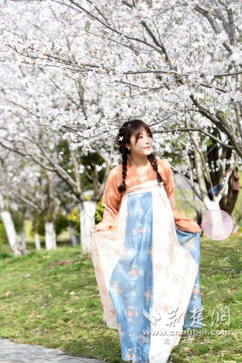 堤角公園園內不少身著漢服、帶齊拍攝裝備的博主前來打卡拍照,將賞花美圖發(fā)布在社交平臺上,帶火“賞櫻”熱度。通訊員供圖