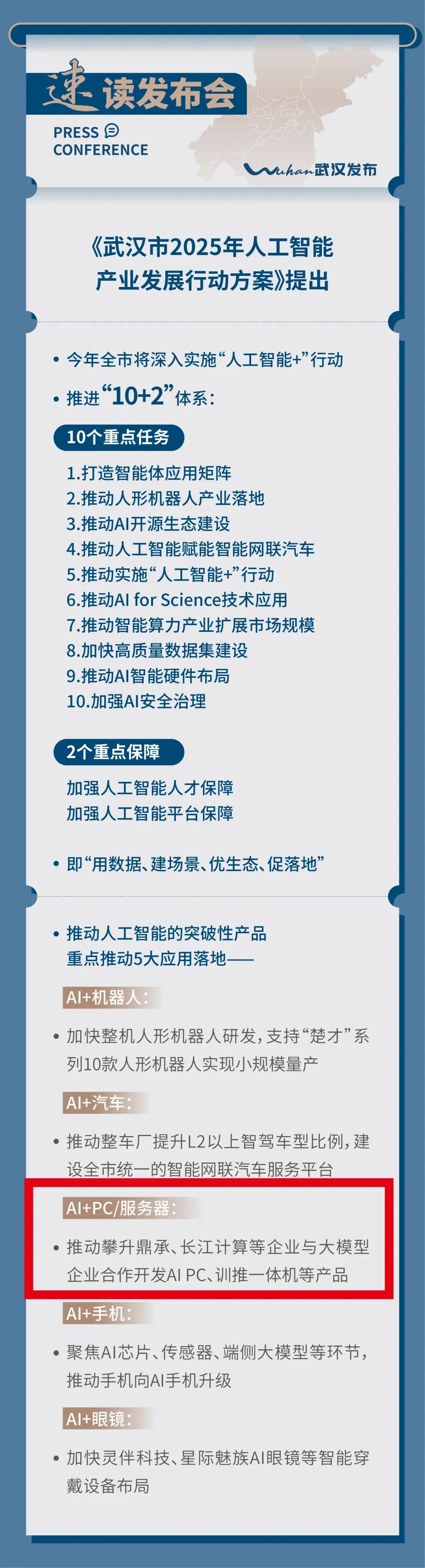 3月10日,《武漢市2025年人工智能產(chǎn)業(yè)發(fā)展行動方案》新聞發(fā)布會召開。《行動方案》明確將“AI+PC/服務(wù)器”列為推動人工智能的突破性產(chǎn)品,作為五大重點應(yīng)用之一予以落地,并點名支持攀升科技等企業(yè)聯(lián)合大模型廠商,攻關(guān) AIPC等產(chǎn)品。