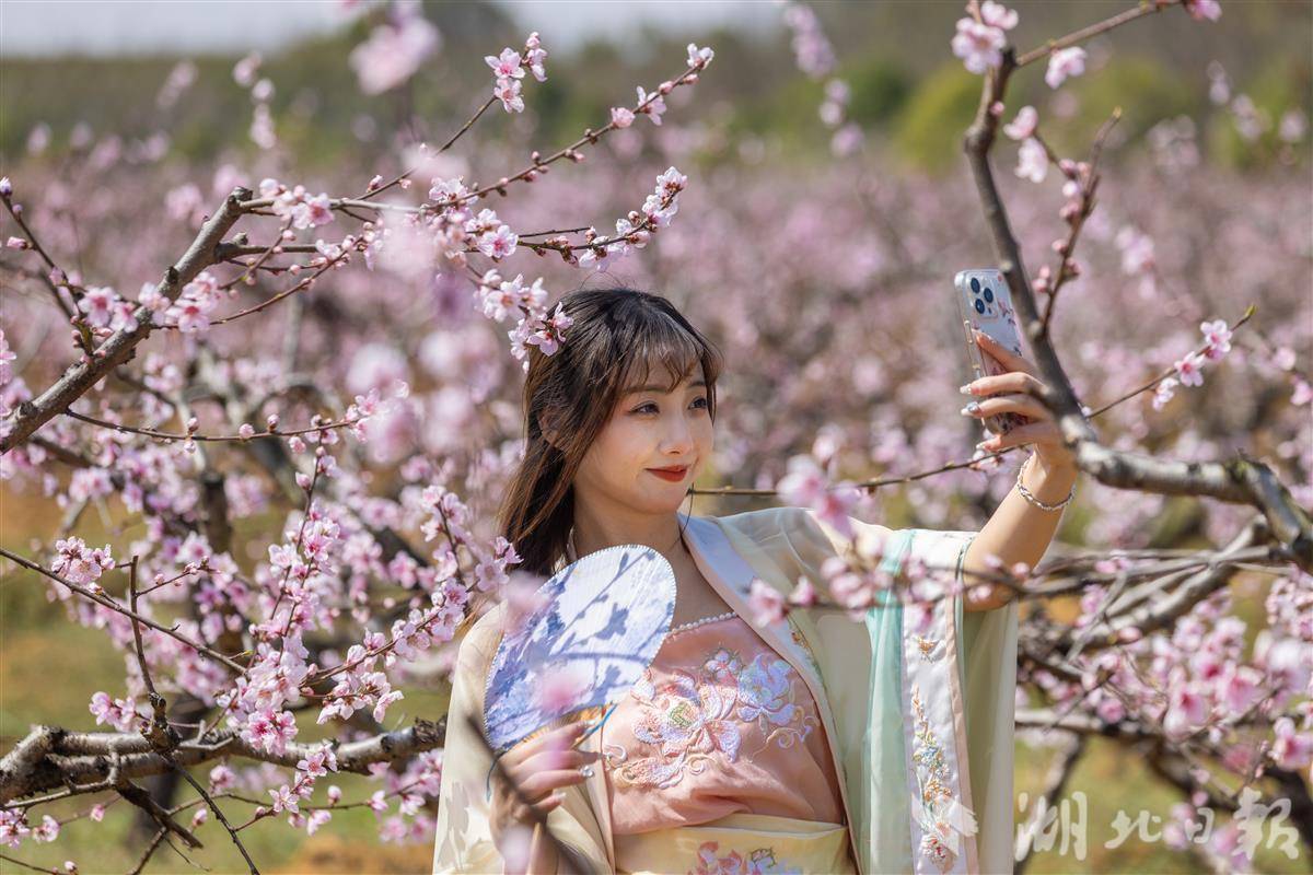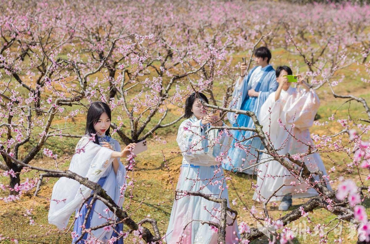 3月18日桃花節(jié)開幕首日,就迎來了武漢、孝感及周邊地市近3萬名游客。原野花海,田園林間,盡是拍照打卡的笑臉,宋代文豪蘇東坡筆下“花發(fā)顏如醉”的詩意景象仿佛在此重現(xiàn)。據(jù)悉,當(dāng)?shù)靥一s1/3已完全盛開,整體花海將在一周左右達(dá)到盛放期。