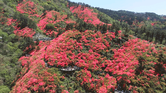 武漢市文化和旅游局,贊1165“人間仙境云霧山,層巒疊嶂映紅天”,木蘭云霧山的杜鵑花以映山紅為主,從3月中旬開始,萬畝野生紅杜鵑競相綻放,春風(fēng)吹過,此起彼伏,如霞似火,嫣然一片杜鵑花的海洋。