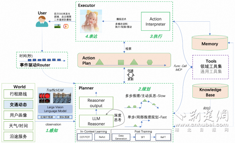 “傳統(tǒng)導(dǎo)航像按劇本演戲,預(yù)設(shè)路線后便機械執(zhí)行;而我們的智能體更像經(jīng)驗豐富的‘老司機’,能實時感知路況、預(yù)判風(fēng)險并主動調(diào)整策略?!?/p>
