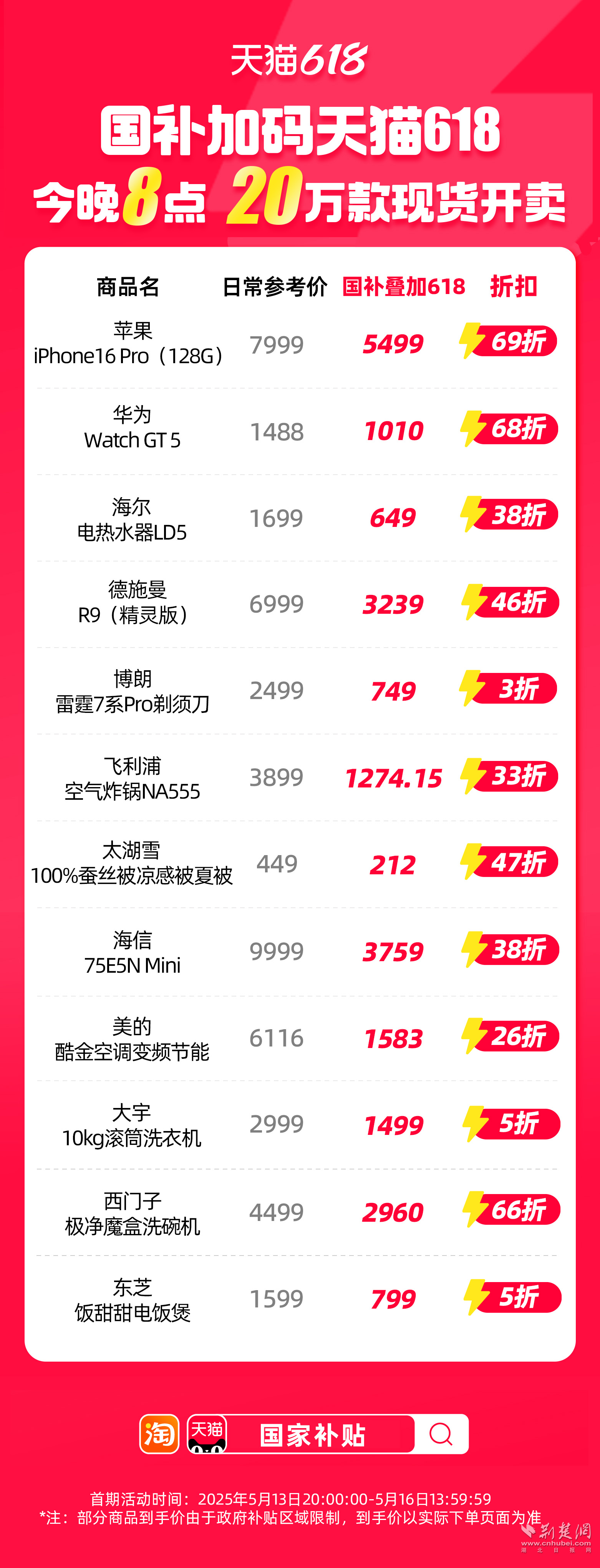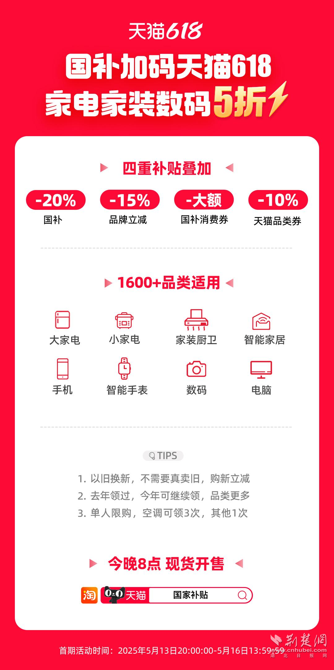 荊楚網(wǎng)(湖北日?qǐng)?bào)網(wǎng))訊(通訊員 朱飛)天貓618重磅加碼國(guó)補(bǔ),家電、家裝、家居、3C數(shù)碼等品類(lèi)將低至5折,今晚8點(diǎn),現(xiàn)貨開(kāi)賣(mài)。