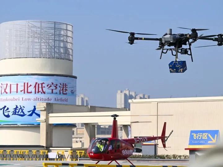 裝配快遞盒的無人機(jī)在漢口北低空港無人機(jī)停機(jī)坪起飛。新華社記者 肖藝九 攝