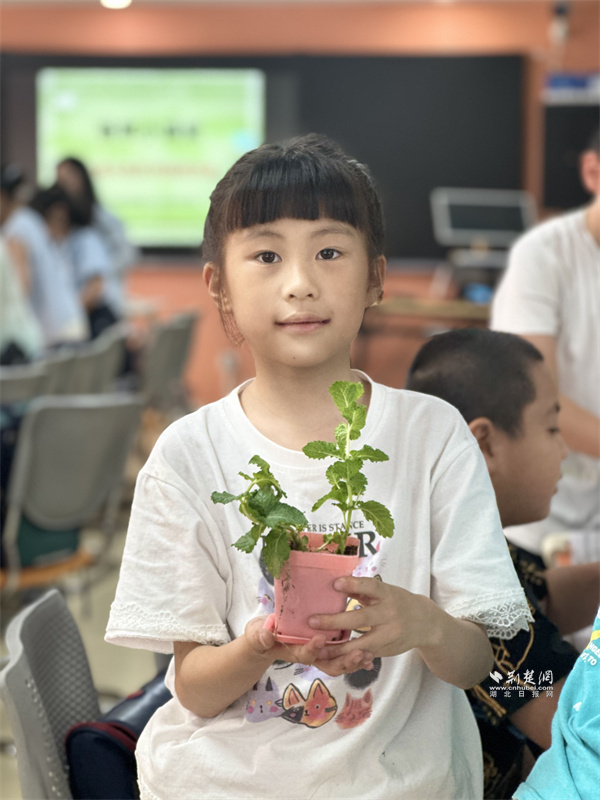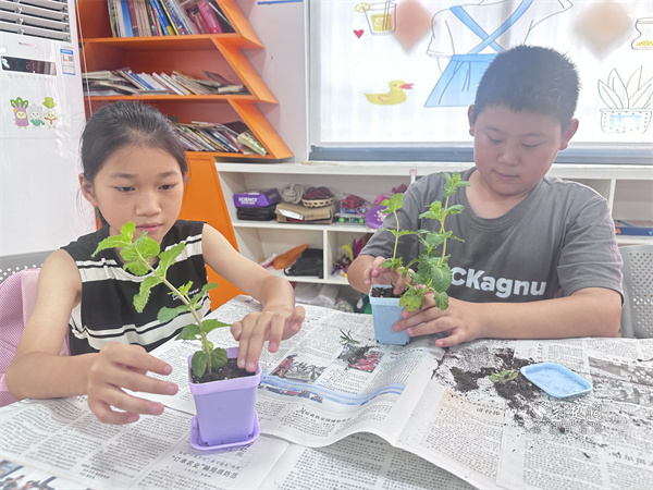 種植環(huán)節(jié)中,周帆帶著薄荷苗、花盆和泥炭土,手把手指導(dǎo)填土、定植、澆水。孩子們邊操作邊交流,指尖沾著泥土也興致勃勃。武漢市青山區(qū)鋼城第十九小學(xué)學(xué)生彭思瑞笑言:“我是托管班‘老學(xué)員’,連續(xù)三年參加暑期托管班,在這里上課比打游戲更有成就感,泥土的味道讓我很放松。”