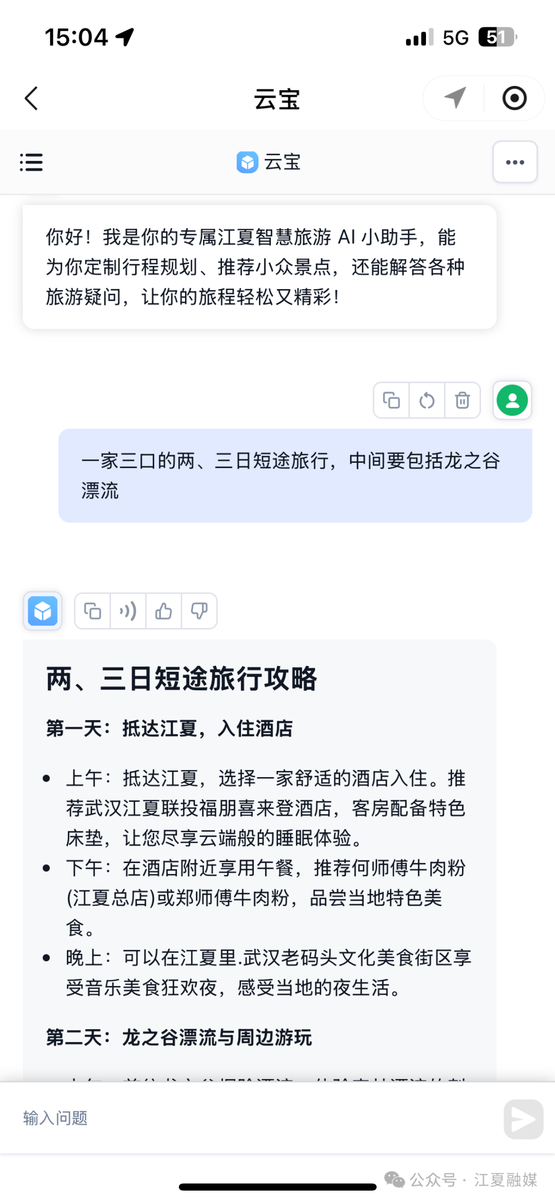 今年5月,基于騰訊元寶大模型,“云游江夏”小程序上線一款獨(dú)家AI——云寶,通過智能化技術(shù)全面升級(jí)游客體驗(yàn),同時(shí)為景區(qū)管理注入數(shù)字化活力。借助AI智能導(dǎo)游和個(gè)性化推薦功能,游客可享受定制化行程規(guī)劃;同時(shí),AI即時(shí)應(yīng)答服務(wù)則能快速解決如查找景區(qū)信息等實(shí)用問題,大幅提升出游便利性。