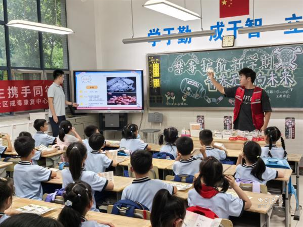 荊楚網(wǎng)(湖北日?qǐng)?bào)網(wǎng))訊(通訊員 陳博龍)為進(jìn)一步增強(qiáng)青少年毒品防范意識(shí),筑牢校園禁毒安全防線,9月8日,在武昌區(qū)禁毒辦的指導(dǎo)下,積玉橋街道聯(lián)合轄區(qū)派出所、社區(qū)戒毒康復(fù)中心及金都藍(lán)灣社區(qū),共同走進(jìn)中華路小學(xué)金都校區(qū),開展以“禁毒護(hù)航新學(xué)期、青春無毒向未來”為主題禁毒教育課堂,通過“宣講+課件+互動(dòng)+宣誓”的豐富形式,為新學(xué)期校園安全增添“防毒屏障”。