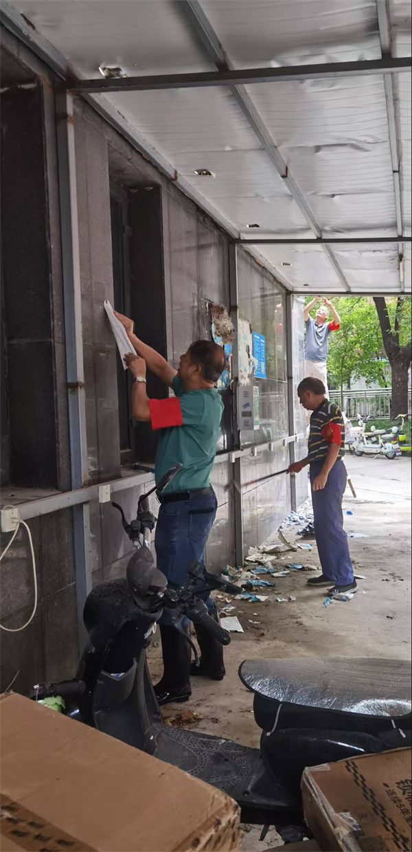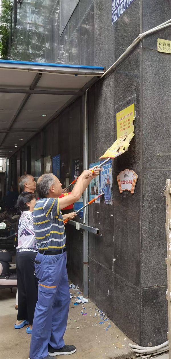行動(dòng)中,志愿者們分為兩組,分工協(xié)作、高效推進(jìn)?!芭Fぐ_”清理組攜帶專業(yè)工具,對(duì)小區(qū)各樓棟墻面、單元門、電梯間及公共設(shè)施上的各類小廣告進(jìn)行徹底清理。面對(duì)黏附牢固的廣告貼紙,大家先以噴壺濕潤(rùn)軟化,再細(xì)致鏟除,最后用抹布擦拭干凈,不遺漏任何一處衛(wèi)生死角。