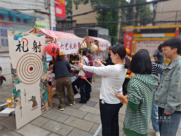 游戲互動區(qū)氛圍熱烈。“射覆猜謎”攤位前,居民踴躍參與,猜中謎底者可獲贈汪玉霞蘇月餅;“投壺納?!蔽娙艘辉嚿硎郑谌の吨懈惺芄哦Y韻味;“福來套圈”則準(zhǔn)備了洗衣液、透明皂等實用獎品,深受居民喜愛。此外,“六藝禮射”項目讓居民親身體驗傳統(tǒng)射藝,在拉弓搭箭間感受古人的尚武精神與禮儀風(fēng)范。