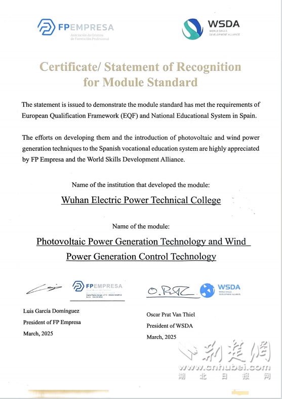 據(jù)了解此次是國(guó)內(nèi)電力類高職院校首次實(shí)現(xiàn)電力課程標(biāo)準(zhǔn)向歐洲國(guó)家的輸出,其價(jià)值不僅在于深化中西兩國(guó)在可再生能源職教領(lǐng)域的合作交流,更關(guān)鍵的是為中國(guó)電力技術(shù)“走出去”戰(zhàn)略提供了配套的技能人才培訓(xùn)支撐,為國(guó)際電力產(chǎn)能合作量身打造出可復(fù)制、可推廣的“武漢電力職教方案”。