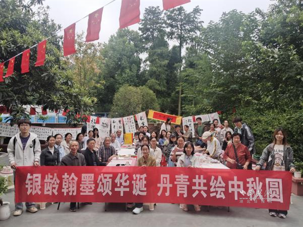 黨課結(jié)束后,長者與志愿者們攜手投入到藝術(shù)創(chuàng)作中。有人揮毫潑墨,以蒼勁有力的筆觸勾勒出祖國的大好河山,展現(xiàn)對祖國的熱愛與贊美;有人奮筆疾書,將“銘記歷史”“吾輩自強”等抗戰(zhàn)主題字句工整地落于紙上,墨香間滿是跨越代際的紅色情懷。兩代人一邊創(chuàng)作,一邊暢聊過往的中秋記憶與見證的祖國變遷,情感在筆墨間悄然流淌。