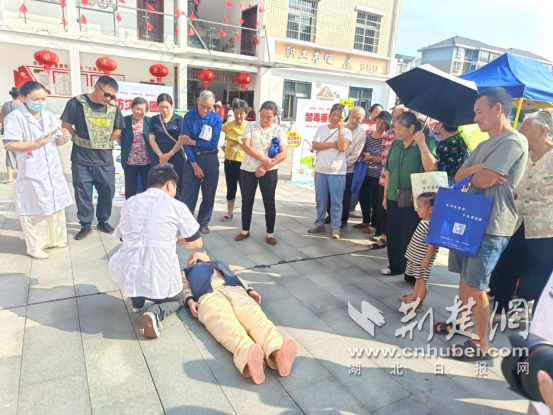 廣場另一側(cè),醫(yī)護人員鋪開模擬人體模型,演示燒傷包扎與心肺復(fù)蘇?!鞍惹鍧崅冢儆眉啿紡膫谙路酵蠈訉庸潭?,松緊度以能伸入一指為宜;做心肺復(fù)蘇時,按壓深度必須達5-6厘米,頻率保持每分鐘100-120 次,節(jié)奏就像跟著‘1001、1002’數(shù)數(shù)一樣均勻?!贬t(yī)護人員一邊說,一邊用手比劃著關(guān)鍵動作。講解完畢,邀請居民實操,遇到按壓角度偏斜、力度不足的情況,便俯身手把手糾正,耐心調(diào)整姿勢,確保每個人都能真正掌握正確要領(lǐng)。