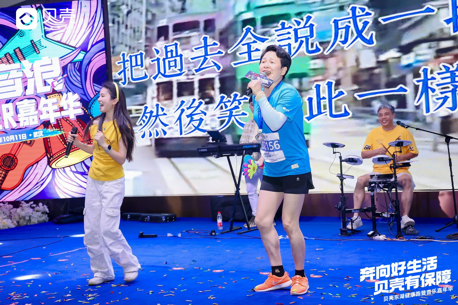 熱干面樂隊(duì)率先登場(chǎng),熟悉的“漢話”旋律一響,立刻點(diǎn)燃全場(chǎng)熱情,跑者們跟著節(jié)奏齊聲大合唱,歌聲此起彼伏。樂隊(duì)還特意邀請(qǐng)剛跑完步的選手上臺(tái),大家不分彼此,一起對(duì)唱經(jīng)典曲目,時(shí)而互動(dòng)打趣,時(shí)而跟著節(jié)拍跳舞,汗水未干的臉上滿是笑容,將運(yùn)動(dòng)后的快樂與音樂的狂歡完美融合。