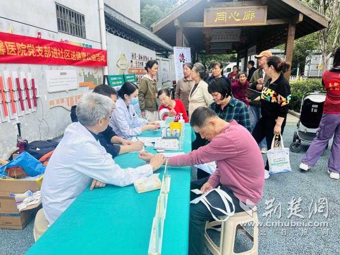 在另一角落,醫(yī)護人員耐心講解健康知識,社??ㄞk理區(qū)的漢口銀行工作人員忙個不停,為居民免費辦理社保卡升級業(yè)務(wù)。