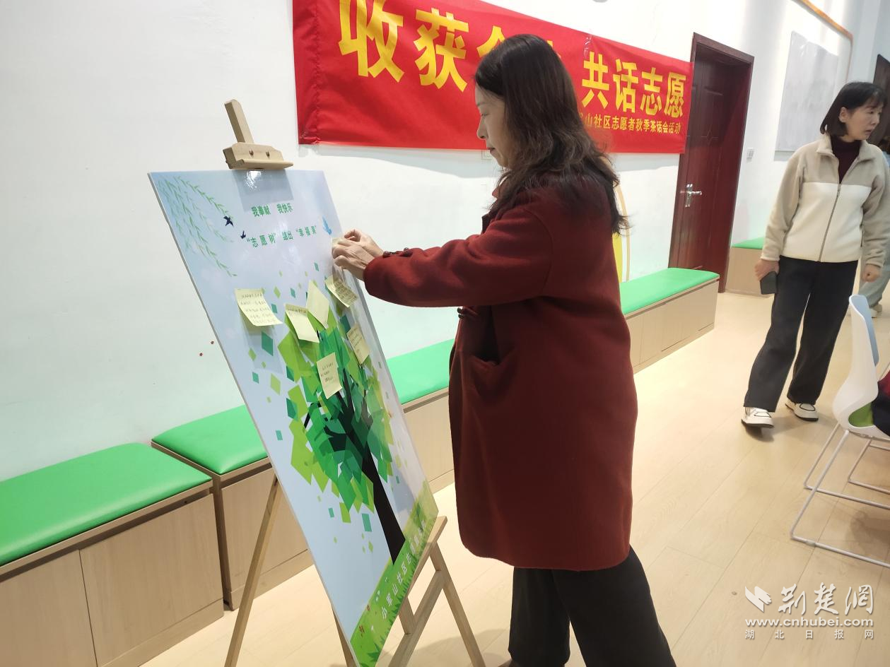 志愿者將寫有服務記錄的便利貼貼在展板上。通訊員供圖