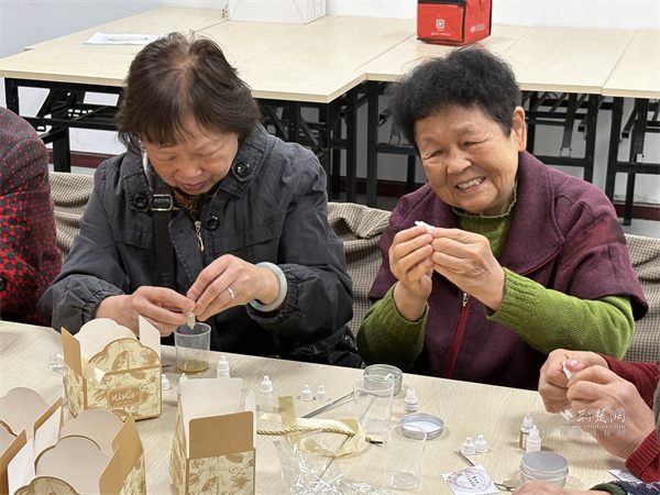 在大歌笛湖小區(qū)鄰里客廳內(nèi)熱鬧非凡,水拓扎染絲巾的制作現(xiàn)場,老人們按照工作人員講解的步驟興致勃勃地動手實踐,讓一幅幅色彩斑斕、花紋各異的絲巾作品逐漸成型,老人們拿著自己親手制作的絲巾,成就感滿滿。天然蜂蠟護手霜DIY環(huán)節(jié),大家按照配比將蜂蠟、橄欖油等材料混合加熱、攪拌、裝罐,制作出天然無添加的護手霜,既實用又健康。鄰里客廳外的便民服務也同步貼心上線,免費理發(fā)、血壓測量、法律咨詢等服務,切實幫助老年人解決實際需求,讓“笛韻”成為串聯(lián)健康、睦鄰、便利生活的“銀齡生活協(xié)奏曲”,串聯(lián)起銀齡幸福生活。