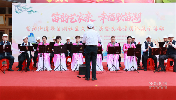 敬老月活動的重頭戲——“笛韻藝家親,幸福歌笛湖”文藝匯演,在社區(qū)居民的期待中精彩上演。激昂的開場音樂鼓瞬間點燃了現(xiàn)場氣氛;飽含深情的集體詩朗誦《偉大的祖國》抒發(fā)了對祖國的熱愛與祝福;口琴軍歌三連奏用熟悉的旋律勾起了現(xiàn)場觀眾的共同記憶;運動模特走秀展現(xiàn)出了獨特的銀齡魅力;郭書文團隊的電吹管表演用悠揚的旋律將匯演氣氛推向高潮。整場文藝匯演內(nèi)容豐富、形式多樣,不僅為社區(qū)老年人提供了一個展示自我的平臺,更營造了歡樂祥和的節(jié)日氛圍。