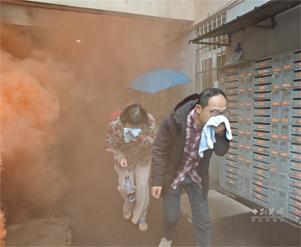 隨后,6棟居民樓模擬火災疏散演練啟動?!盁熿F彈點燃!滅火組壓制初期火源,疏散組組織撤離!”指令下達后,滅火組迅速攜帶器材沖進樓道撲救模擬起火點;疏散組手持熒光指揮棒,在樓層樓梯口、轉角處布控,引導居民彎腰捂鼻、有序撤離。