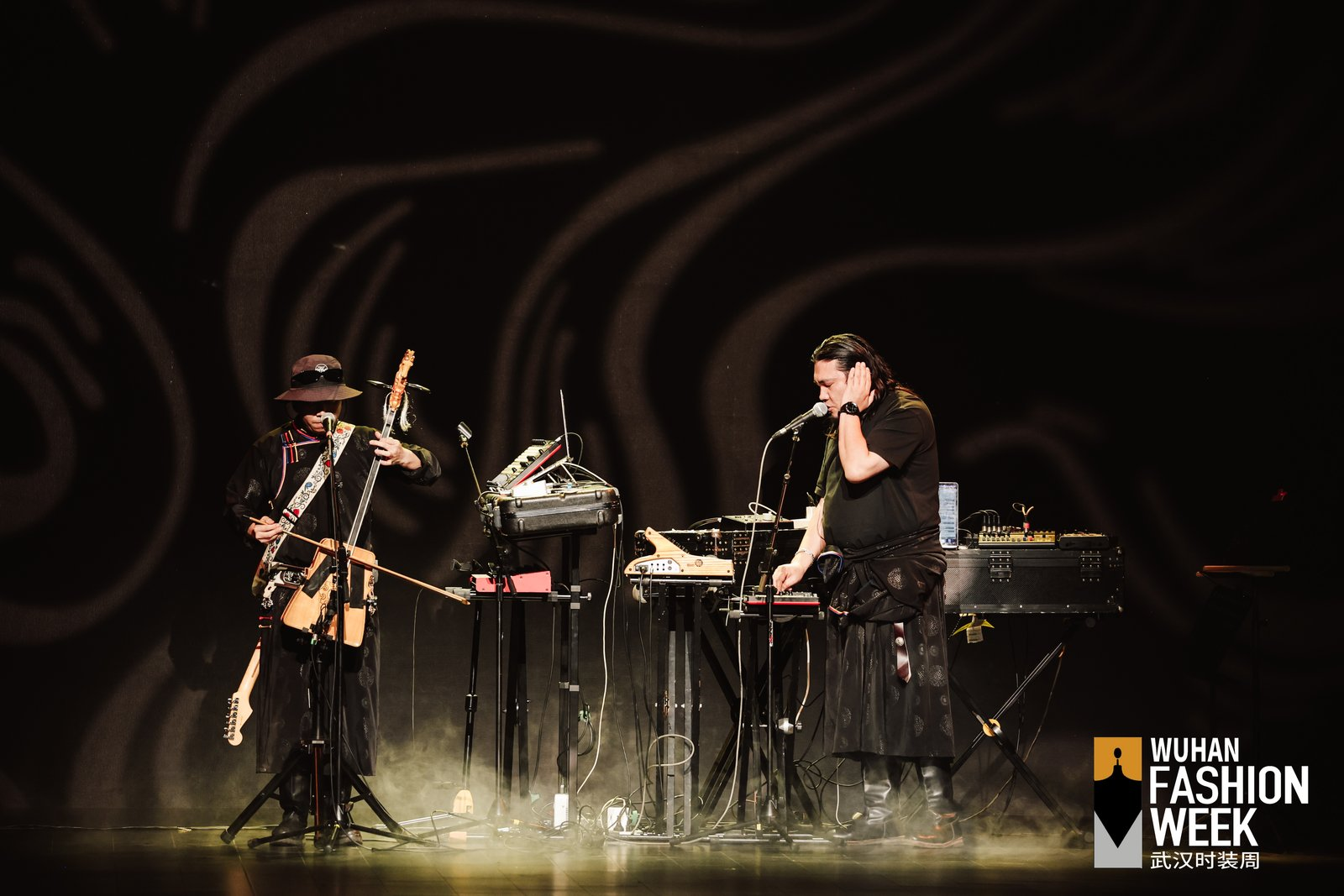 陳宇攜手Taiga樂隊,把錫林郭勒草原的晨霧、馬頭琴與電子節(jié)拍轉(zhuǎn)化成可行走的時裝音景??沙掷m(xù)植物素皮、流蘇與繩結(jié)形成呼應(yīng),讓游牧精神在當(dāng)代廓形中保持自由。