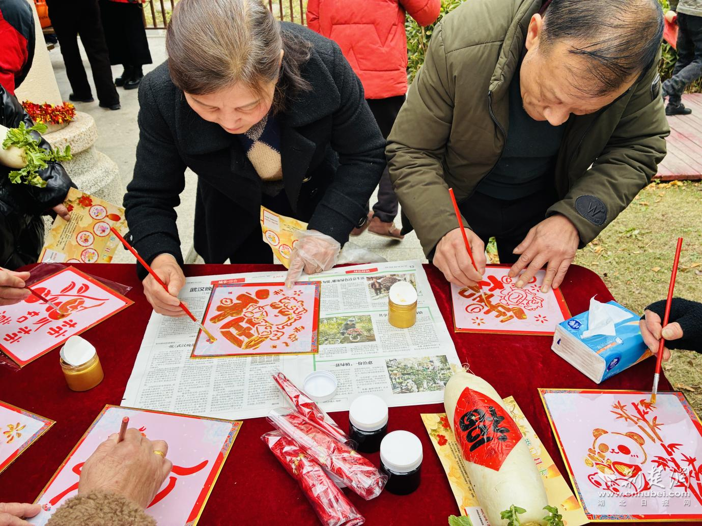 手工體驗區(qū)則充滿了濃厚的文化韻味,大家在志愿者的指導(dǎo)下,將雕刻著不同書體“?!弊峙c馬年吉祥紋樣的模板,小心翼翼拓印在紅色宣紙上。當(dāng)一幅幅帶著墨香的福字躍然紙上,不僅定格了傳統(tǒng)技藝的獨特魅力,更承載著大家對新年福氣盈門的美好期盼。“我拓了一個‘?!?,打算帶回家貼在門上,希望新的一年全家都福氣滿滿!”一位年輕媽媽舉著自己的作品,開心地分享道。