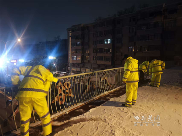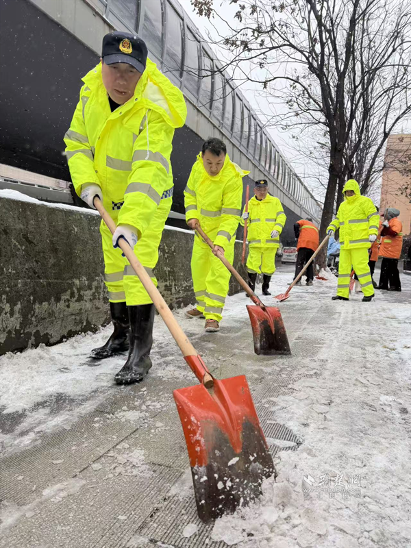 1月19日深夜至20日凌晨,隨著雪勢(shì)加大,街道應(yīng)急搶險(xiǎn)隊(duì)伍迅速化身“風(fēng)雪夜行人”,頂著嚴(yán)寒奔赴一線(xiàn)。他們采取機(jī)械作業(yè)與人工作業(yè)相結(jié)合的方式,對(duì)轄區(qū)主次干道、橋梁、陡坡、十字路口等重點(diǎn)路段和易結(jié)冰區(qū)域,進(jìn)行循環(huán)撒布融雪鹽和清掃作業(yè),最大限度預(yù)防道路結(jié)冰。寒夜中,隊(duì)員們衣衫被雪花浸濕,臉頰被寒風(fēng)凍紅,但無(wú)人退縮,持續(xù)堅(jiān)守。天色微明,雪勢(shì)稍歇,隊(duì)伍立即轉(zhuǎn)戰(zhàn),對(duì)背街小巷、人行道、天橋等區(qū)域的殘留積雪進(jìn)行清理,并在坡道、臺(tái)階等易滑處鋪設(shè)防滑草墊、設(shè)置警示標(biāo)識(shí),全力保障早高峰出行安全順暢。