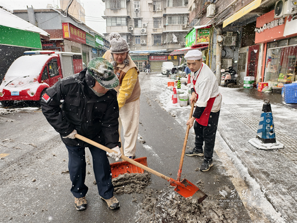 20日清晨,糧道街胭脂路部分路段冰雪堆積,步行、車行存在安全隱患。沿街商戶主動設立板凳、雪糕筒提醒路人繞行,并拿起掃把清掃路邊積雪,方便路人安全通過?!斑@是武漢的第一場雪,雖然很美,但路滑容易摔跤,我們早點把門口掃干凈,大家走路就放心了?!币晃簧虘衾习逡贿吂讱庖贿呎f道。這一把把掃帚不僅掃去了積雪,更暖了人心,商戶們用最樸實的行動,在寒冬街頭筑起了一道溫暖的安全防線,展現(xiàn)了“社區(qū)是我家”的主人翁精神。