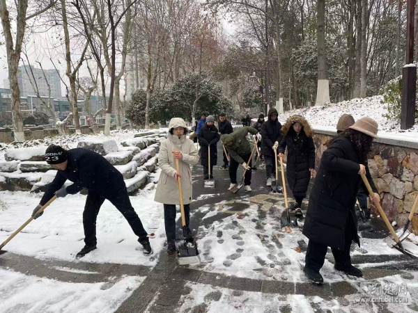 武漢大學(xué)人民醫(yī)院黨委書記、院長(zhǎng)與干部職工一同清掃院區(qū)積雪。 通訊員供圖