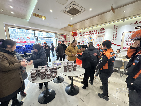活動(dòng)現(xiàn)場(chǎng),“暖心聯(lián)盟”企業(yè)劉胖子家常菜館中央花園店開(kāi)展“暖心臘八粥 暖胃更暖心”服務(wù),提供百余份臘八粥。工作人員將臘八粥分裝至便攜餐盒,搭配一次性餐具,供戶外工作者排隊(duì)領(lǐng)取,方便其攜帶食用。外賣小哥夏博文表示,驛站每逢節(jié)日都會(huì)組織關(guān)懷活動(dòng),剛開(kāi)完晨會(huì)就能吃上熱粥,切實(shí)感受到“娘家人”的關(guān)懷,渾身充滿干勁。