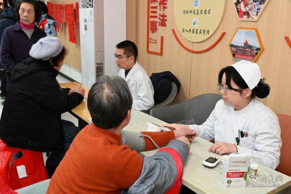 健康義診區(qū)里,武漢市第三醫(yī)院的醫(yī)護(hù)團(tuán)隊(duì)耐心為居民測(cè)量血壓、血糖,細(xì)致解答健康疑問(wèn),并給予個(gè)性化指導(dǎo)?!霸诩议T(mén)口就能享受到這么周到的醫(yī)療服務(wù),心里特別踏實(shí)?!本用窭畎⒁踢B連稱(chēng)贊。